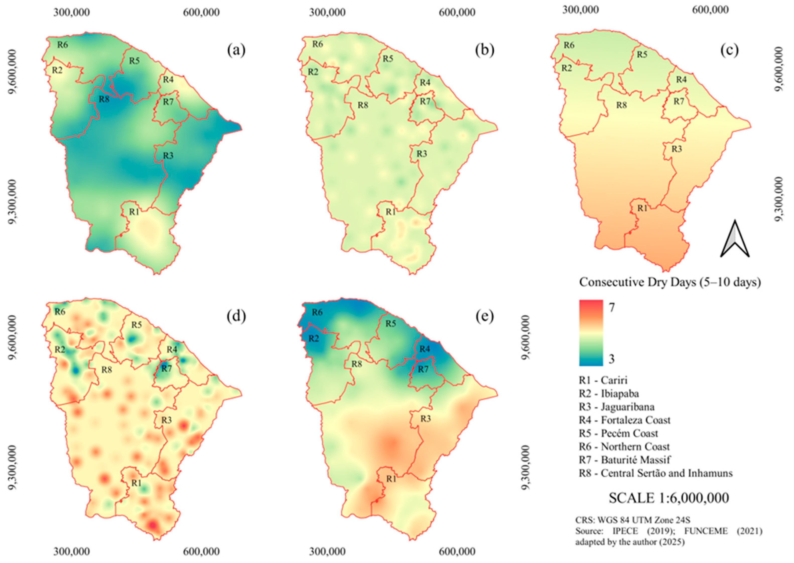 - Rodrigues, B.D.; Coutinho, M.D.L.; Sakamoto, M.S.; Jacinto, L.V. Uma análise sobre as chuvas no Ceará baseada nos eventos de el niño, la niña e no dipolo do servain durante a estação chuvosa. RBClima 2021, 28. Available online: https://revistas.ufpr.br/revistaabclima/article/view/76238/43620 (accessed on 30 October 2025). [CrossRef]