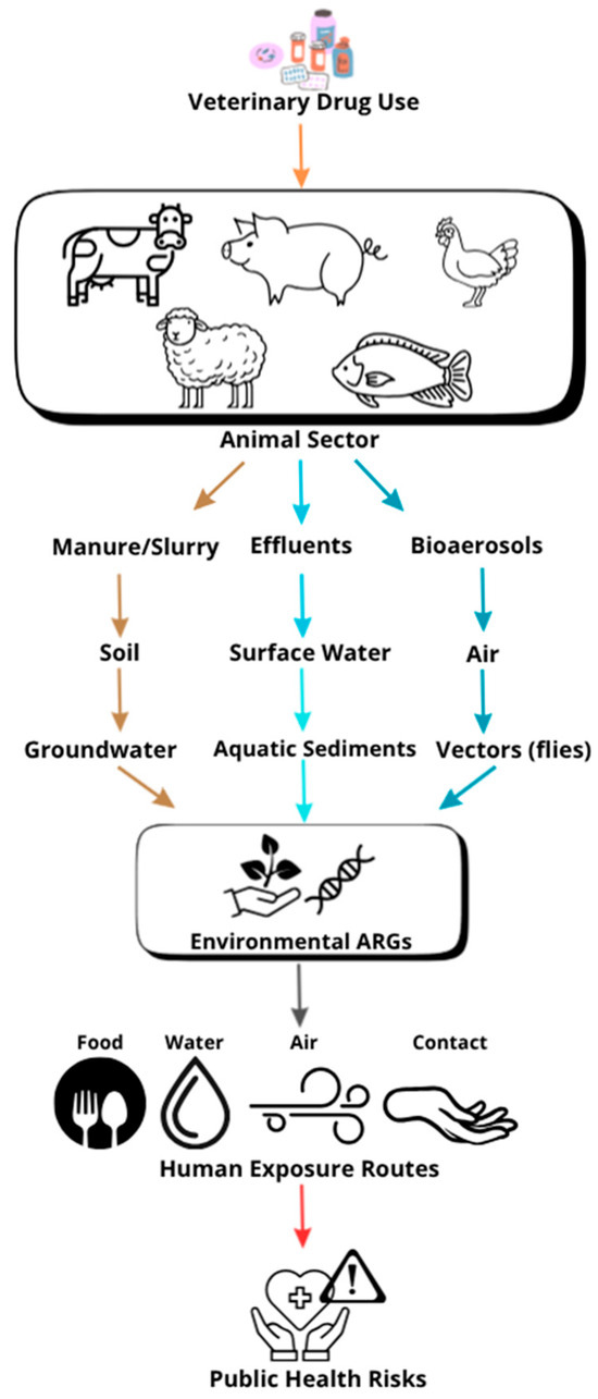 | Environmental reservoirs | Manure, slurry, and pasture soils | Manure and grazing areas | Litter, dust, and runoff from poultry houses | Manure lagoons and contaminated soils, microplastics in manure and effluents | Sediments, water columns, and biofilms |