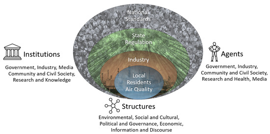 Agents are divided into internal (e.g., politicians, political parties, business associations, community organisations) and external groups (e.g., foreign NGOs, multinational corporations, regional organisations). The focus of analysis are the key questions: Who are the key stakeholders in the political economy of air quality governance in the Upper Hunter?, and, What is their influence on the governance of air quality in the region? The analysis within this article investigates the mining and resources sector through both vertical and horizontal scales [39] to identify the factors (drivers of change) and incentives for improving air quality in the short, medium, and long term [23]. A conceptual framework of the governance landscape used in this study is presented in Figure 1.