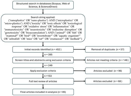 The representative search string applied in all databases was: (“nanoplastics” OR “nano-plastics”) AND (“microplastics” OR “micro-plastics”) AND (“toxicity” OR “toxic effects” OR “toxicological response” OR “oxidative stress” OR “inflammation” OR “immunotoxicity” OR “neurotoxicity” OR “endocrine disruption” OR “genotoxicity” OR “bioaccumulation”) AND (“animal *” OR “fish” OR “mammal *” OR “bird *” OR “invertebrate *” OR “aquatic organism *” OR “zebrafish” OR “mice” OR “rat *” OR “crustacean *” OR “mollusk *”).