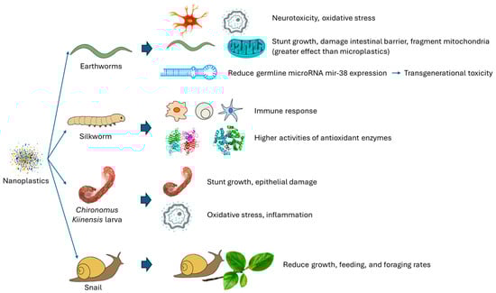 Contino et al. [62] investigated the sublethal effects of amino-modified polystyrene nanoplastics (50 nm and 100 nm) on Artemia salina (Linnaeus, 1758), a key aquatic species. The larvae of A. salina were exposed to 10 and 20 mg/L of nanoplastics for 48 h. While no lethal effects were observed, nanoplastics accumulated in the body and caused malformations in the gut and body size, increased apoptosis, and elevated oxidative stress. These effects were more pronounced with higher concentrations and smaller particle sizes, highlighting a size-dependent toxicity [62].