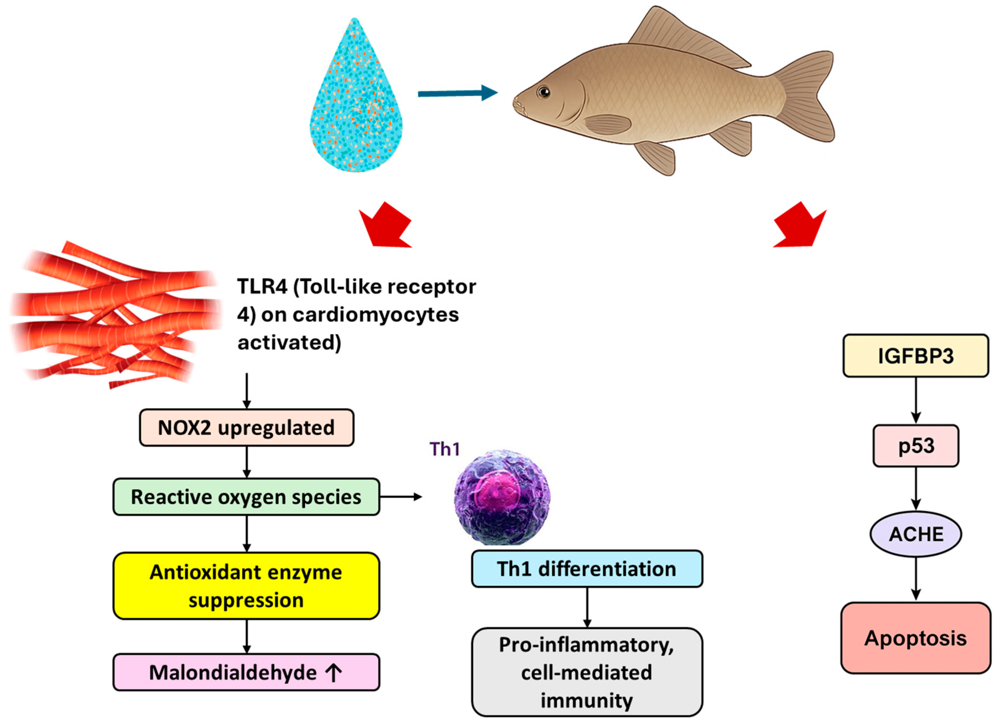 | Common carp (C. carpio) | Polystyrene, 50–400 nm | 1000 µg/L; 28 days | Myocardial inflammation and apoptosis; ↑ TLR4, NOX2, reactive oxygen species, malondialdehyde; ↓ antioxidant enzymes; Th1 immune shift | Size-dependent oxidative stress and cardiac inflammation | [81] |