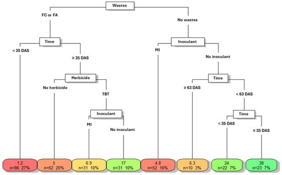 Figure 2 presents a decision tree illustrating the combinations of experimental factors evaluated in terms of phytotoxicity in M. pruriens. These factors are organized into categories such as plant developmental stage, herbicide application (tebuthiuron), and microbial inoculant use (with or without). The numerical scale associated with each combination reflects the level of phytotoxicity, with lower values indicating greater damage to the plant. Colors follow a thermal gradient, where warm tones (red) represent high phytotoxicity and cool tones (green) indicate lower impact. The numerical values (e.g., 1.2; 6.9) correspond to mean phytotoxicity scores, while “n=” denotes the number of individuals analyzed. Percentages indicate the proportion of those samples relative to the total.