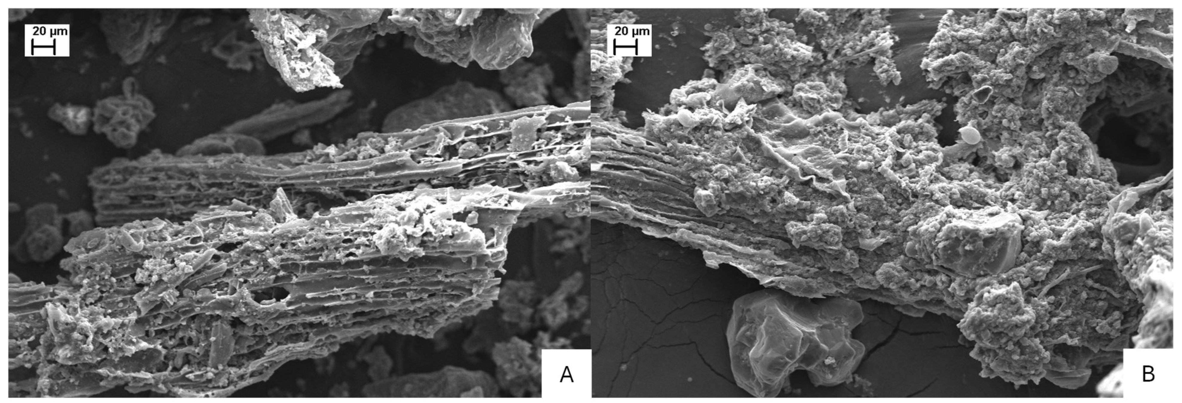 In contrast, the filter cake composted with ash (FA) presented a fragmented and porous morphology, characterized by granular aggregates, irregular surfaces, and visible interparticle voids (