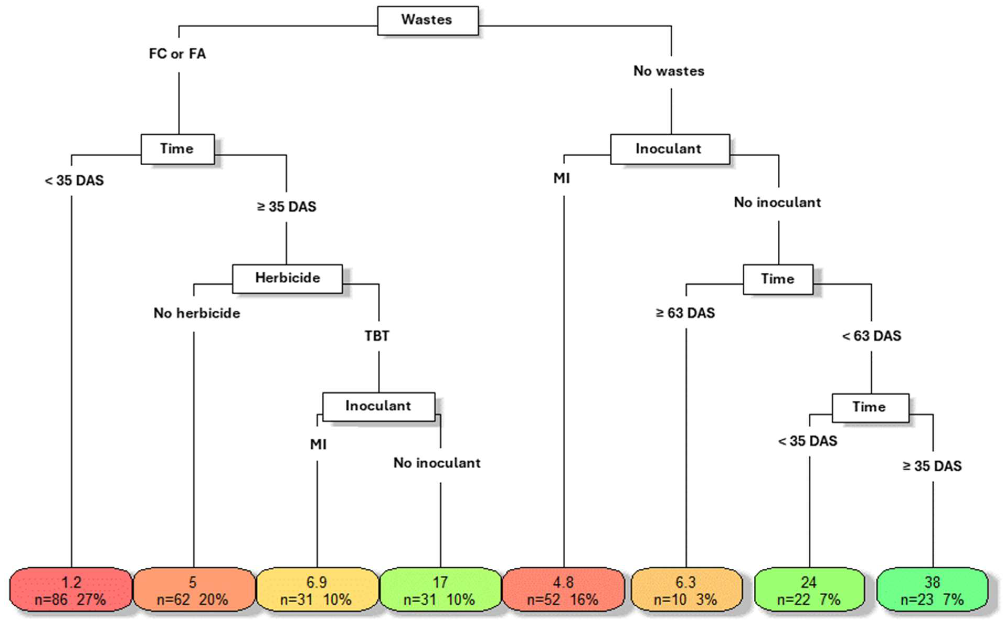 In this scenario, other factors such as the use of tebuthiuron and microbial inoculant emerged as secondary variables. In the absence of herbicide, phytotoxicity was 5.0 (20%), whereas its application resulted in lower levels of damage, suggesting a potential mitigation of toxic impact. Regarding the inoculant, its use led to a further reduction in phytotoxicity (6.9–10%), while in its absence, the value was 2.4 times higher (17.0–10%). Nevertheless, these factors showed a quantitatively smaller influence on the response variable when compared to the development time and, most notably, the presence of sugarcane industry wastes. This is evidenced by the fact that 67% of the samples analyzed were directly influenced by the addition of FC or FA.