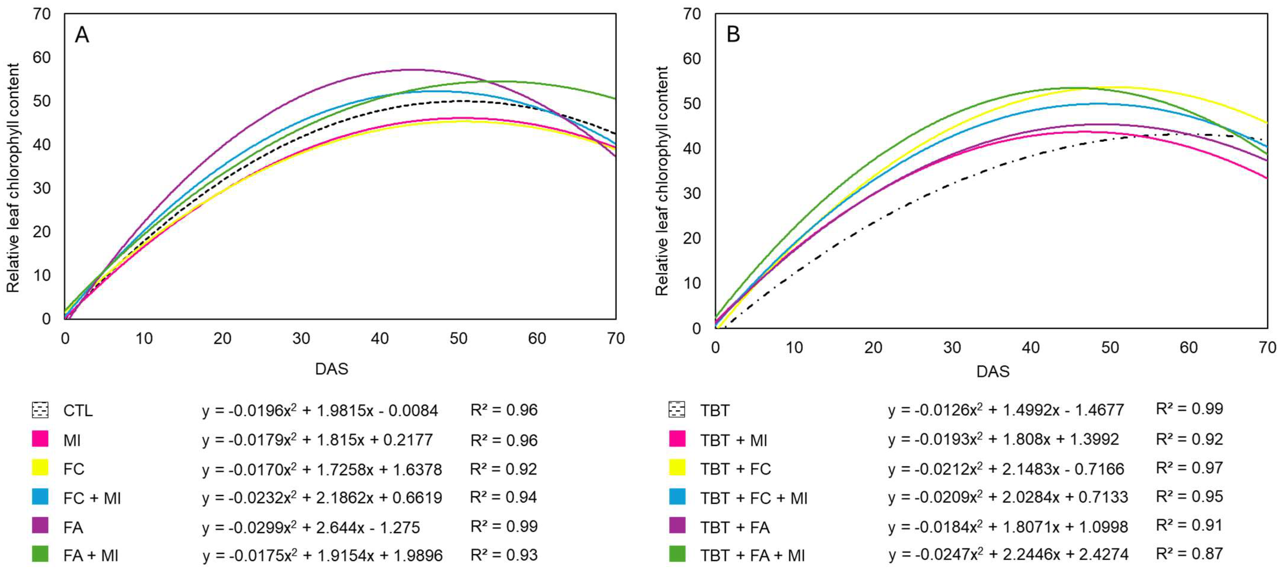 Analysis of the polynomial equation coefficients reinforces the toxic effect of tebuthiuron. In the control treatment (CTL), the coefficient was −0.0196, with peak RLCC occurring around 35 DAS. In contrast, the TBT treatment showed a less pronounced coefficient (−0.0126) and a delayed peak at approximately 45 DAS, confirming the herbicide-induced delay in photosynthetic development. Although bioinputs such as the FA + MI combination were tested, the results did not demonstrate superior performance, suggesting that in contaminated soils, the interaction between herbicide, microbiota, and nutrients is complex and may offset the benefits of composting. The simultaneous presence of organic compounds and microorganisms can affect mineralization rates, alter pH, and interfere with nutrient dynamics, making the effects less predictable [