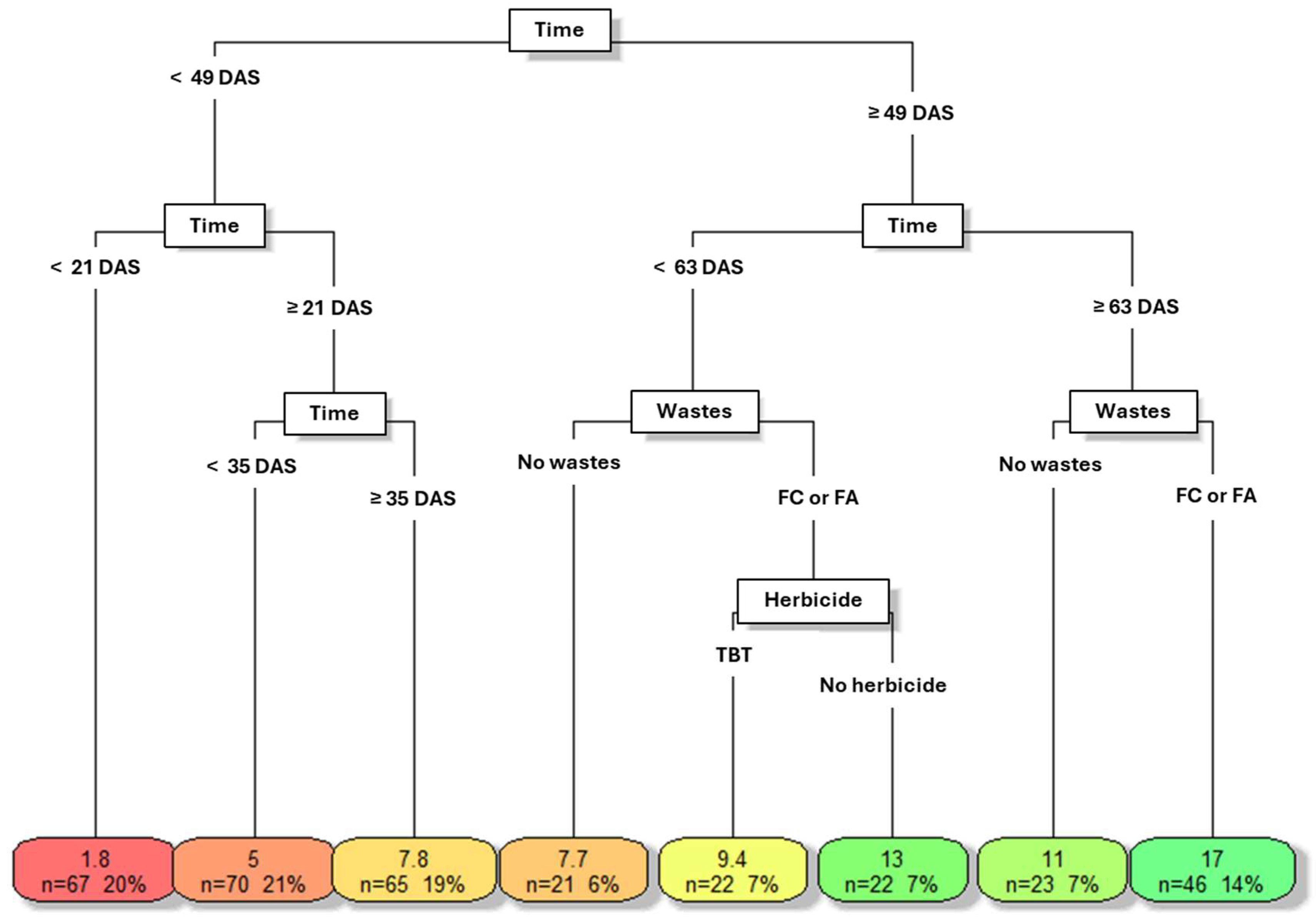 For plants grown ≥49 DAS, the incorporation of organic residues, traditional filter cake (FC) or composted with ash (FA) emerged as a secondary determinant of biomass. This finding aligns with the phytotoxicity decision tree (