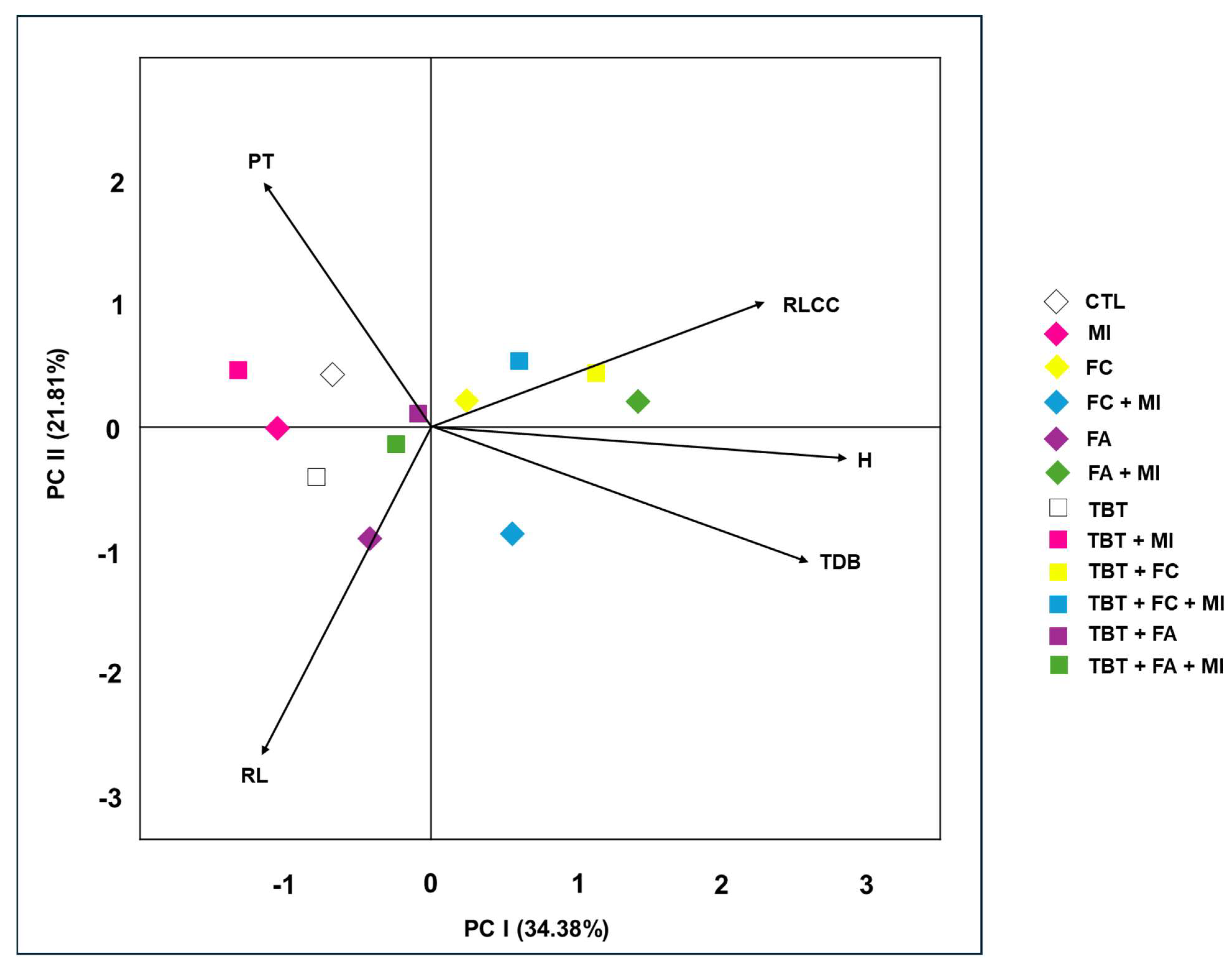 Among the evaluated treatments, FA + MI, TBT + FC, and TBT + FC + MI most positively influenced plant growth and physiology, as evidenced by the vectors for H and RLCC. These findings align with the data presented in