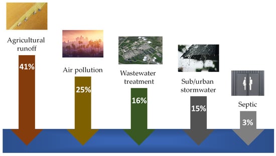 Nitrogen (N) is a fundamental nutrient in limiting primary productivity in many aquatic ecosystems []. Its natural biogeochemical cycle involves complex transformations between various inorganic and organic forms, including atmospheric nitrogen (N2) and ammonia (NH3), ammonium (NH4+), nitrite (NO2−), and nitrate (NO3−) ions, dissolved organic nitrogen (DON), and particulate organic nitrogen (PON) [,]. Key microbial processes, such as N fixation, nitrification, denitrification, and ammonification, govern the availability and fate of these species []. However, over the past century, human activities, primarily intensive agriculture (fertiliser use), combustion of fossil fuels (atmospheric N deposition), and discharge of untreated or inadequately treated wastewater (sewage) have drastically increased N loading levels into freshwater, estuarine, and coastal marine ecosystems globally [,] (Figure 1).
