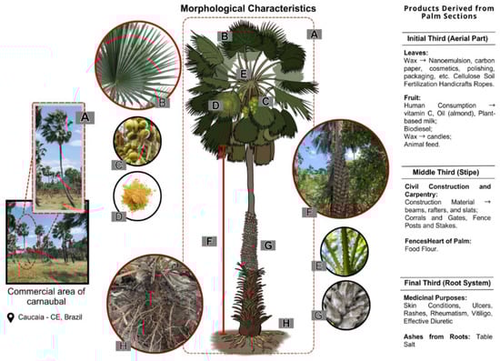 Figure 1. Morphological detailing, products, and by-products of carnauba (Copernicia prunifera (Mill.) H.E. Moore). A—Complete view of the carnauba palm tree; B—leaves; C—fruits; D—ceriferous layer that forms on the surface of the leaves in detail; E—petiole with thorns in detail; F—trunk without branches, in the upper part marked by scars left by leaves that have completely fallen, and in the lower part with leaf sheaths that have not yet fallen; G—detail of the trunk with dry hems that did not fall; H—roots.