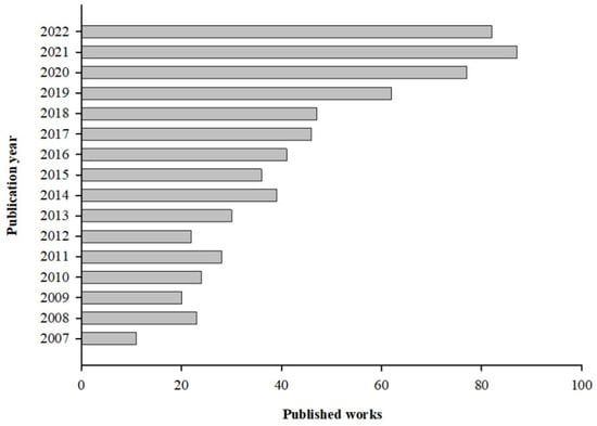 Figure 2. Number of articles published in the Web of Science database using the keywords “copernicia” and “carnauba”, from 2007 to 2022.
