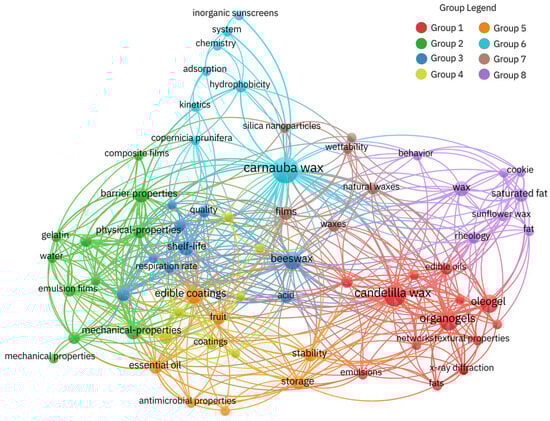 The VOSviewer program analyzes the input file, generates the network map, and finally provides map visualization and exploration functions. In turn, the visualization map shows the keywords or terms in the data file based on the clustering techniques available in VOSViewer [36]. To explore the current topics and possible future topics on carnauba, a keyword co-occurrence analysis was performed using VOSviewer, from which eight groups represented by eight different colors were formed (Figure 3). The colors represent groups of terms that have a stronger relationship with each other [37].
