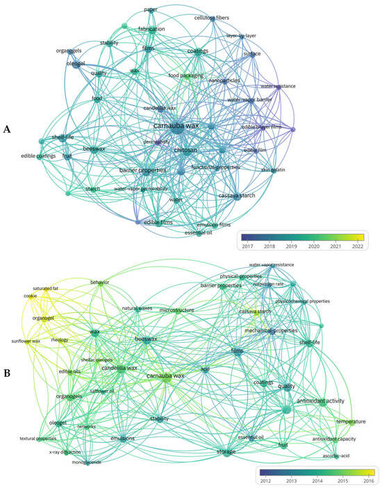 Group 2, in green, is composed of nine words, the most representative of which are “barrier properties” and “physical properties”. In this group, the research topics focus on the use of biofilms from carnauba. In group 3 (dark blue), the words “beewax” and “shelf-life” stand out, referring to studies involving different types of waxes in the development of technologies and products that increase the shelf life of various products (Figure 3). The wax derived from this palm tree has the greatest hardness and the highest melting point among all commercial natural waxes, has low solubility, and is composed mainly of aliphatic esters and cinnamic acid diesters, which gives it a certain stability [14]. However, despite having good properties, carnauba wax is not commonly used for manufacturing films due to its low mechanical strength and is, therefore, often used in the manufacturing of composite films with other biopolymers [32].