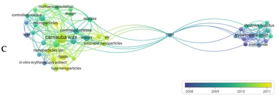 In Brazil, research is also mainly related to points about carnauba wax, which is evidenced by the fact that six of the seven groups formed in the network are closely linked to the term “carnauba wax”. The most peripheral group of words (in green) includes works related to botanical aspects of carnauba and also works on the life cycle of disease vectors that shelter in palm trees, such as the kissing bug, which transmits the protozoan Trypanosoma cruzi, which causes Chagas disease (Figure 5A).