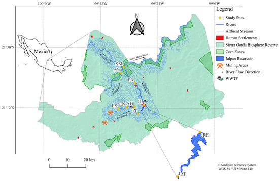 The SGBR ranks among the most valuable Natural Protected Areas (NPAs) of Mexico, spanning an area of 3836 km2 in the Central Mexican Plateau. The study area is located between 20°50′–21°45′ N and 98°50′–100°10′ W. The local climate is characterised by a semi-hot to warm temperature range and sub-humid to semi-dry conditions. The average annual temperature is predominantly above 18 °C. Precipitation above 80 mm from June to October. The region supports diverse vegetation, including pine, oak, and deciduous forests, as well as xeric scrub. Four major rivers—Escanela, Jalpan, Ayutla, and Santa María—flow through the reserve as tributaries of the Tamuín River, joining the Pánuco River and ultimately discharging into the Gulf of Mexico [31]. The studied river sections range from 1253 to 480 m a.s.l. The Jalpan Reservoir, located at the confluence of the Escanela and Jalpan Rivers, has been designated as a Ramsar site of international importance (No. 1352) [32]. The SGBR comprises eleven core zones where activities are primarily restricted to conservation and research [33]. Anthropogenic influences include human settlements (notably the towns of Ahuacatlán and Jalpan), tourism, sport fishing, farming, and mining (over 100 mines, mainly artisanal) [34,35,36] (Figure 1).
