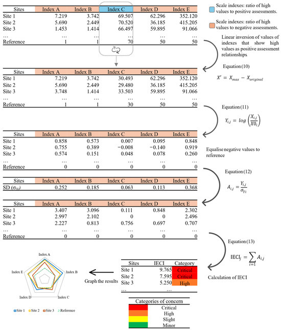 The previous indices were integrated into the IECI, which was conducted following next steps and mathematical procedures: