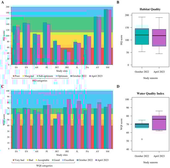 Habitat quality (HQ) had average scores of 121 ± 43.25 and 116 ± 46.23 in October 2022 and April 2023, respectively, suggesting an acceptable overall quality and reflecting long-term physical integrity. However, study site JRE reflected “poor quality”, and sites AH, JRT, JL, and PA had “marginal quality” in both seasons; sites ES, EN, PI, AY, and SM showed “sub-optimal” and “optimal” qualities (Figure 3A,B). Water quality (WQI) was similar between study seasons (p = 0.218); nevertheless, the average score in October 2022 was 68 ± 6.24, suggesting an overall “good quality”, and in April 2023 it was 74 ± 8.51, indicating “excellent quality”. Among study sites, the lowest values were obtained at JRT in both seasons (52 in October 2022 and 62 in April 2023); the rest of the sites showed “good to excellent” water quality with scores above 60 (Figure 3C,D).