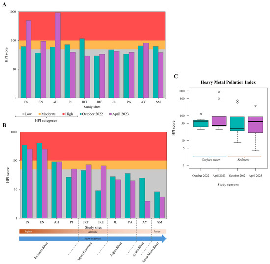 Study sites showing high levels of TMs pollution in surface water were JRT (HPI = 116) in October 2022 and ES and AH (HPI = 501 and 934, respectively) in April 2023. In sediment, these sites were ES (HPI = 352 and 415) and EN (HPI = 256 and 254) for both study seasons (Figure 4A,B). There were no significant temporal differences in HPI scores between surface water and sediment (Kruskal–Wallis’s test, p = 0.636) (Figure 4C). The average contributions of each TM to HPI, from highest to lowest, were: Cr > Al > Cd > As > Pb > Fe in surface water and Fe > Cr > Cd > As > Al > Pb in sediment during October 2022; Cr > Al > Cd > As > Fe > Pb in surface water and Fe > Cr > Cd > Al > As > Pb in sediment during April 2023. In other freshwater systems, values that were considered critical contamination levels (HPI > 100) have been reported. Values in the range of 100–150 have been reported in surface waters of lentic systems in India, some attributed to the proximity of coal mines [71,72], while in the Barnoi River in Bangladesh, HPI values of 122 to 463 were reported [73].