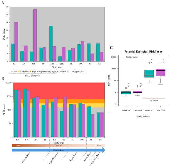 On the other hand, the concentrations of the TMs analysed in surface water were of “low ecological risk” at all study sites for both seasons. Most sites obtained PERI scores below 15, except for sites JRT (October 2022), and ES and AH (April 2023), which yielded values above 20 (PERI = 22.90, 25.12, and 33.48, respectively) (Figure 5A). In sediment, sites JRE (PERI = 79.13) in October 2022, AY (PERI = 48.02) in April 2023 and SM (PERI = 62.83 and 62.52) in both study seasons showed “low ecological risk”; however, there were sites such as ES, EN, and AH (PERI > 785) which in both study seasons reached the category of “significantly high ecological risk” (Figure 5B). In both study seasons, the ecological risk shown by the PERI was significantly higher in sediment than in surface water (p < 0.0001) (Figure 5C). In mining regions, PERI values averaging 47.4 were reported in water from the Hunhe River Basin, China [75], and ranging values from 83 to 929 in sediments from the Aries River Basin, Romania [76]. In Mexico, very high PERI values in sediments ( = 4276.13) were obtained in the San Juan–Taxco River System in Guerrero State, considering potential toxic elements such as Pb and Cd [77].