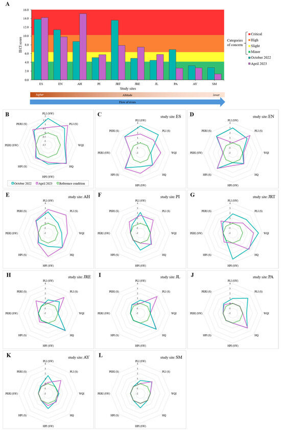 Integrated Environmental Conditions Index (IECI). (A) IECI values in study sites during each study season; (B) patterns of the indices evaluated by the IECI in the study seasons; (C–L) patterns of the indices evaluated by the IECI in each study site during study seasons. Study sites: ES, Escanela; EN, Escanelilla; PI, Pizquintla; AH, Ahuacatlán; JRT: Jalpan Reservoir Tributary; JRE: Jalpan Reservoir Effluent; PA, Purísima; JL, Jalpan; AY, Ayutla; SM, Santa María.