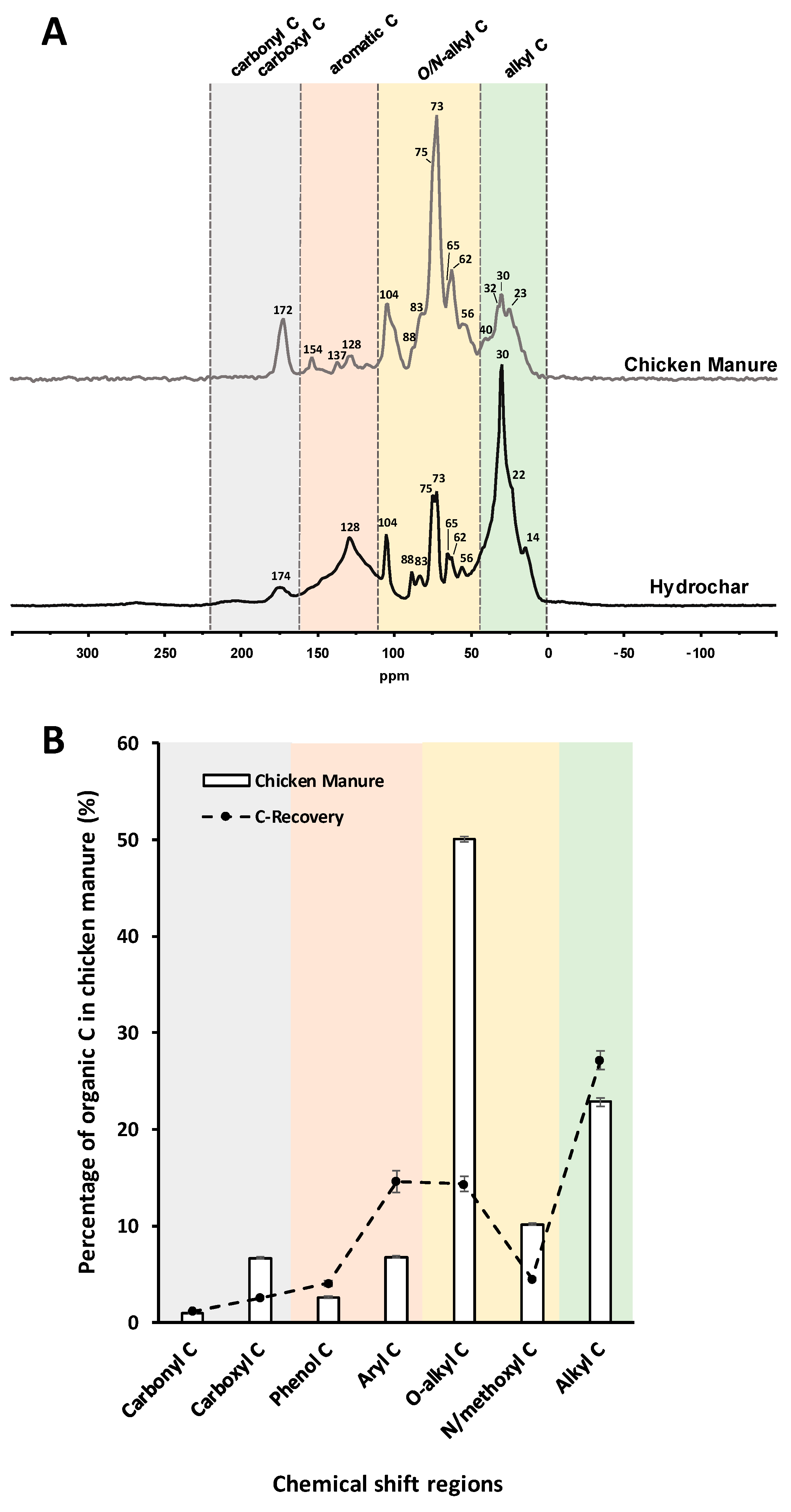 - Santoro, M.C.; Ghanim, B.M.; Kwapinski, W.; Leahy, J.J.; Freitas, J.C. Solid-State NMR Study of Hydrochars Produced from Hydrothermal Carbonization of Poultry Litter. ACS Omega 2024, 9, 45759–45773. [Google Scholar] [CrossRef] [PubMed]