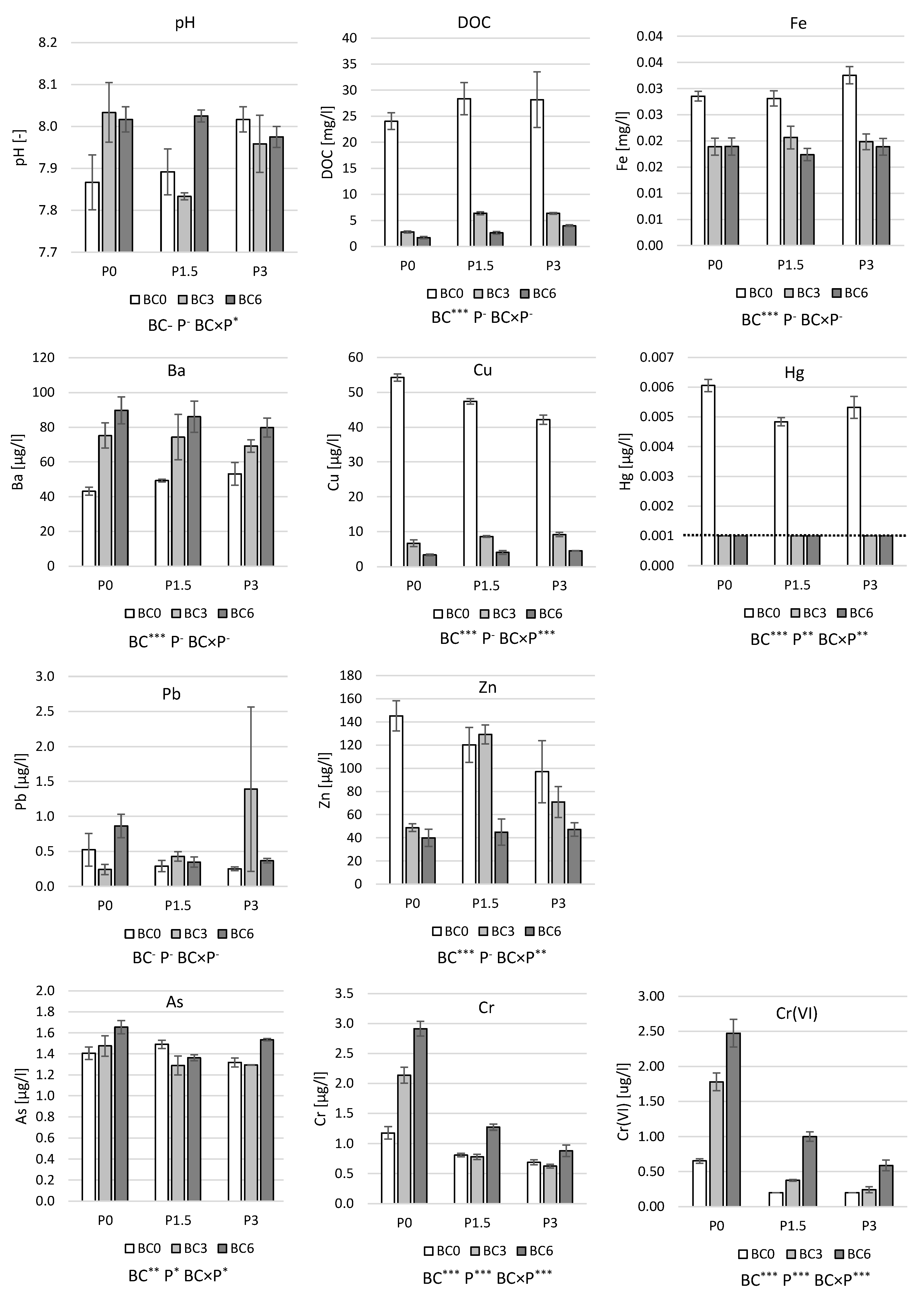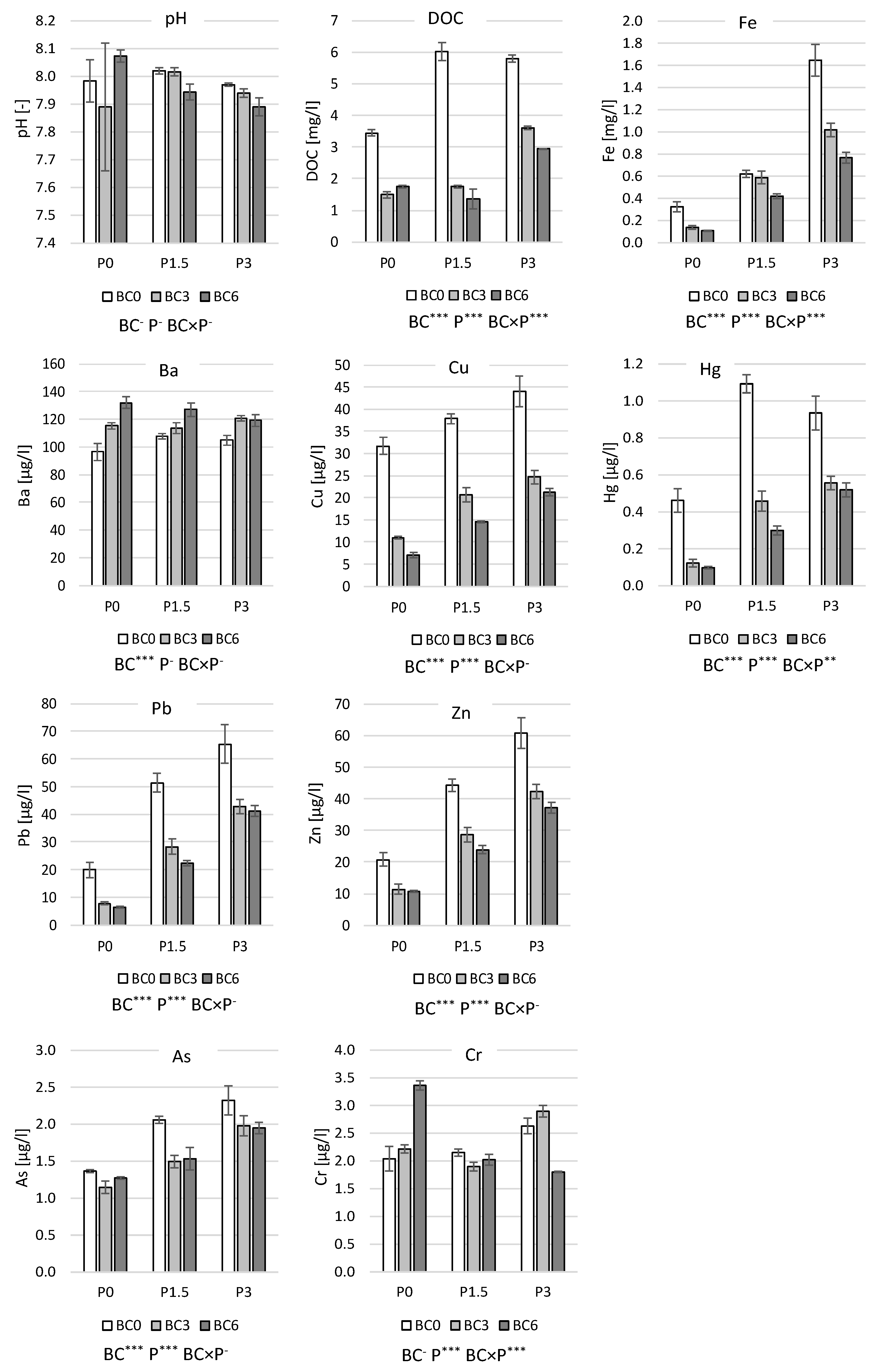 3.1. Biochar and Peat Effects on Metal Concentrations in In Situ Soil Solutions