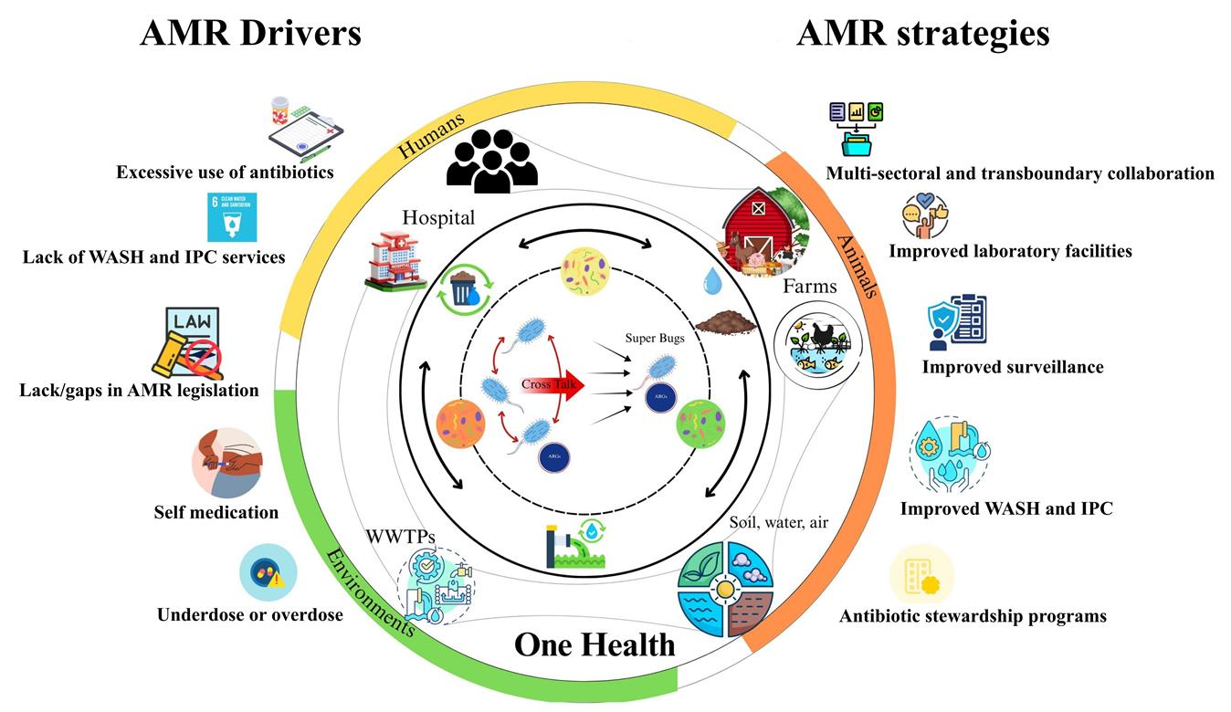 - How do healthcare facilities contribute to and experience the impacts of AMR within a One Health context?