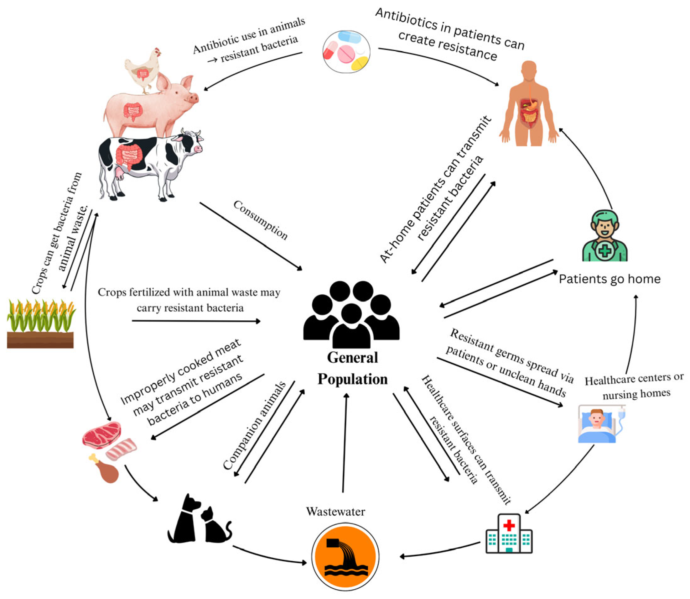 - Endale, H.; Mathewos, M.; Abdeta, D. Potential Causes of Spread of Antimicrobial Resistance and Preventive Measures in One Health Perspective-A Review. IDR 2023, 16, 7515–7545. [Google Scholar] [CrossRef] [PubMed]