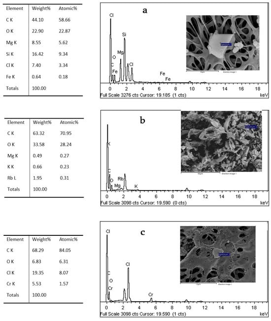 In the chemical composition of the samples, the following elements were detected in order of molecular weight percentage: C > O > Si > Mg > Cl > Fe (Figure 2a), C > O > Rb > K > Mg (Figure 2b), C > Cl > O > Cr (Figure 2c), from compounds such as SiO2, KCl, MgO and CaCO3. Also, albite, undefined Rb, undefined Cr, Ba, and Mn were detected. In other samples also analyzed, C > O > Si > Al > K, C > O > Si > Mg > Cl > Fe, Cl > O > Al > Ca, C > O > Cl > Al > F, C > Cl > Al > Cu were detected.