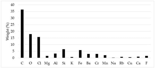 As for the chemical composition of the particles detected in the samples taken inside the TMOWs, as can be seen in Figure 4, the chemical elements detected by SEM from highest to lowest average percentage by weight were as follows: C > O > Cl > Si > Fe > Al > Ba > Cr > Mn > Mg > F > Ca > Rb > K > Cu > Na. It can be observed that C and O total more than 50%, probably due to the tire dust (CaCO3 and SiO2) present in the air of the workshop. On the other hand, the abundance of Cl (15.7%) could be due to Cl from the PVC filter used in the sampling.
