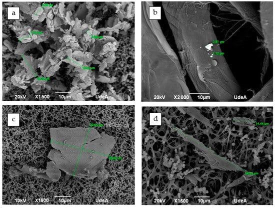Microphotographs of some particles (a–d) that were detected in the samples together with the particle size measurements.