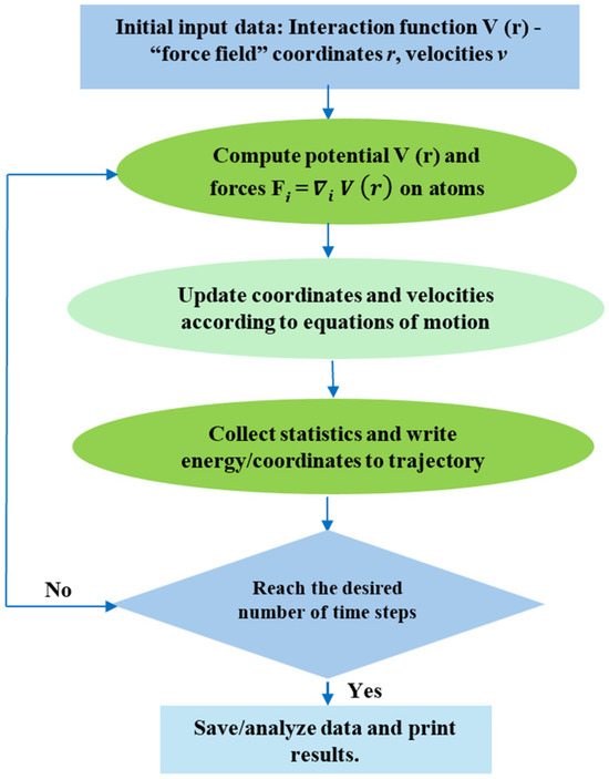 MD is a computational method that simulates the interactions between atoms or molecules based on Newtonian physics. It models molecular bonds and angles as springs and uses algorithms like SHAKE to maintain the correct atom separations [103]. MD allows for detailed simulations of ionic and molecular motions, surpassing traditional experimental methods that only provide a macroscopic view. MD simulations calculate forces acting on atoms through potential functions that define atom interactions. The positions and velocities of atoms are updated using equations derived from the Verlet method [104]. Additionally, thermodynamic variables like pressure and temperature are controlled using tools such as thermostats and barostats [105]. For instance, the Nose–Hoover thermostat controls temperature by simulating coupling between the system and an imaginary temperature reservoir, while the Nose–Hoover barostat maintains constant pressure by allowing the MD cell to change shape [106]. These techniques help maintain a system’s desired thermodynamic state throughout the simulation. The basic algorithm for MD is described in Figure 1.