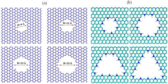 (a) Graphene membrane with dimensions of 30 × 30 Å2 and different pore diameters 9, 11, 13, and 15 Å. Reprinted from [112], copyright 2022, with permission from Springer Nature. (b) Different pore shapes of graphene membrane. Reprinted from [107], copyright 2024, with permission from Elsevier.