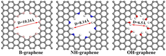 An overhead perspective of three functionalized graphene materials with B, NH, and OH. The membrane's carbon atoms are shown in gray, boron in pink, nitrogen in blue, oxygen in red, and hydrogen in white. Reprinted from [53], copyright 2017, with permission from Elsevier.