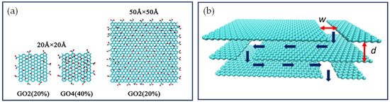 (a) The top view of the GO nanosheets utilized in MD simulations, featuring varying oxidation levels and dimensions. Reprinted from [117], copyright 2022, with permission from Elsevier. (b) A depiction of multilayer graphene membranes utilized for separating metal ions from solutions. The geometrical parameters, w and d, represent the width of the channel and the interlayer separation, respectively. The dark blue arrows indicate the solution flow direction. Reprinted from [118], copyright 2021, with permission from Elsevier.
