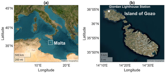 The geographical location of the monitoring site at the Giordan Lighthouse (GLH) on the island of Gozo, Malta: (a) the global location of Malta and (b) the local location of the GLH.