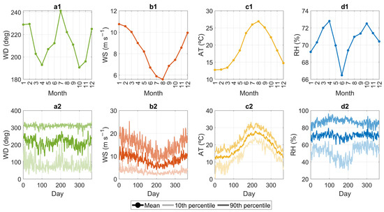 Seasonal composite of meteorological variables. Mean values and mean, 10th, and 90th percentile values at monthly and daily timescales, respectively: (a1,a2) WD, (b1,b2) WS, (c1,c2) AT, and (d1,d2) RH.