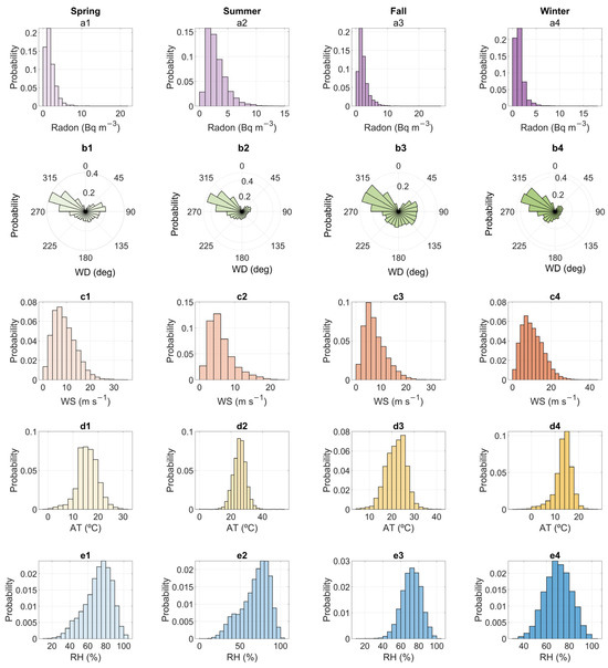 Histograms per season (1 = Spring, 2 = Summer, 3 = Fall, 4 = Winter): (a1–a4) radon, (b1–b4) WD, (c1–c4) WS, (d1–d4) AT, and (e1–e4) RH.