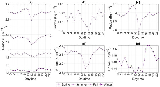 Radon diurnal composite per season: (a) all seasons, (b) spring, (c) summer, (d) fall, and (e) winter. Subplots (b–e) provide insight into seasons individually for better scaled representation of diurnal evolution of radon. Standard deviations are 1.37 Bqm−3, 1.73 Bqm−3, 1.70 Bqm3, and 1.21 Bqm−3, and daytime standard deviations differ by less than 11%, 10%, 13%, and 18% compared to their seasonal values for spring, summer, fall, and winter, respectively.
