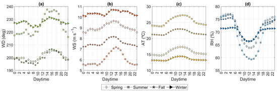 Diurnal composite of meteorological variables per season: (a) WD, (b) WS, (c) AT, and (d) RH.