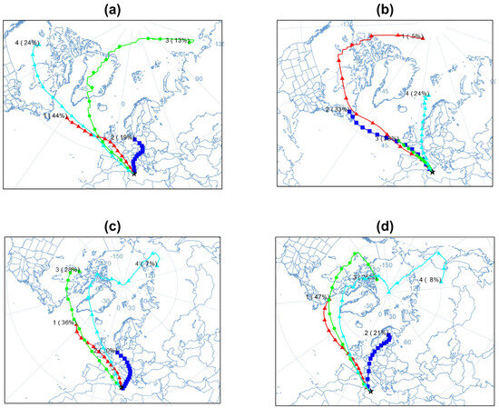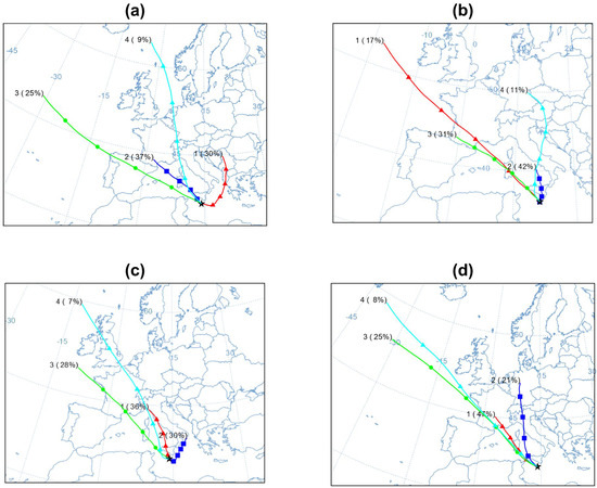 Air mass source clustering based on Hysplit 14-day back trajectories (markers every 24 h): (a) spring, (b) summer, (c) fall, and (d) winter. Colors are automatically assigned and solely represent different cluster trajectories.