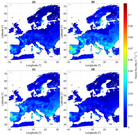 Seasonal radon flux maps calculated from monthly results published by “traceRadon” during period of the study (2011 to 2022): (a) spring, (b) summer, (c) fall and (d) winter.
