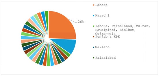 A total of 45 articles were found eligible that analyzed the impact of air pollution on human health in Pakistan (Figure 2). The identified studies were conducted in several cities across Pakistan, with most of them conducted in Lahore, Karachi, Rawalpindi, and Islamabad. Some studies were executed in Kallar Kahar, Sialkot, Bahawalpur, Faisalabad, Jhang, Makland, and the Karakoram Hindu Kush Himalayan Region (Figure 3). Detailed information on the distribution of the studies is presented in Table 1.