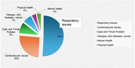This review concentrated on air pollution and smog’s effect on human health. PM2.5, PM10, Sox, NOx, and O3 were the most often investigated air pollutants, while other meteorological indicators were included as the most frequently researched when temperatures were higher than optimum. These pollutants and other temperature variations cause specific cardiovascular diseases and respiratory illnesses including respiratory infections, asthma, lung cancer, allergies, and eye and throat problems; these pollutants also affect mental and physical health (Figure 4). A total of 45 studies that were examined showed the relationship between air pollution and human health and concluded that it had a significant association with asthma, cardiovascular disease, respiratory problems, morbidities, and mortalities. The correlations between human illnesses and air pollution vary depending on the kind of air pollutant, age group, and sex.