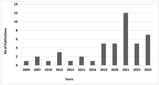 Figure 5 shows the publication years of the articles on the effect of air pollution on human health in Pakistan. The majority of articles were from 2021–2023, which show growing concern and interest in research to understand the effects of air pollution on human health. However, the research began in the early 2000s, which indicates the early recognition of this issue. However, current research studies show a gradual increase in concern about this issue (Figure 5). The progress in research has been triggered by factors such as extreme climatic events, global warming, increasing seasonal variability, increasing climate-induced disasters, crop failure, and outbreaks of diseases. A significant number of studies took place in 2021 due to public awareness as well as the national and international initiatives taken to tackle air pollution and its consequences mainly on human health.