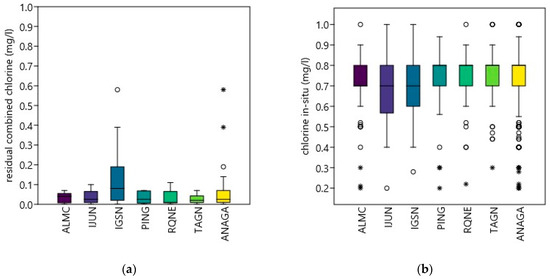 The presence of chloride in drinking water is due to natural causes, industrial effluents and marine intrusion, among others [49,50,51]. Excessive levels of chloride increase the corrosion of metals in pipes, depending on the alkalinity of the water. The WHO has not proposed any reference values for chloride in drinking water from a health point of view, but high concentrations of chloride can cause a detectable taste. However, the available data are insufficient to draw definitive conclusions regarding residual free chlorine and residual combined chlorine. Specifically, 349 samples were below the detection limit of the method and thus did not show detectable levels. This substantial number of non-detections is consistent with the characteristics of the water supply system in the study area, where chlorine levels dissipate rapidly due to factors such as the small size of the system, low storage volumes and limited distribution distances. These non-detections reflect the dynamics of chlorine behaviour in the system rather than sampling or analytical deficiencies. The values for these parameters can be seen in the following figure (Figure 6), specifically for each location, and a total of all the samples represented in yellow.