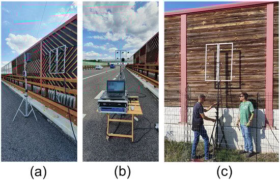 The measurement of the Sound Insulation Index also takes place in two steps, similar to the previous case: measurement with the sound source placed at a distance of 1 m from the roadside surface of the barrier; and microphone grid placed on the opposite side, at a distance of 0.25 m from the rear surface of the noise barrier, as visible in Figure 2c. The free-field measurement is carried out as in the previous case, remembering that the distance between the sound source and the microphone grid must also take into account the thickness of the barrier. Again, in both cases, nine impulse responses are measured from the nine microphones of the microphone array. The semi-anechoic parts of the direct and transmitted impulse responses are windowed according to the Adrienne window [], and from the data contained therein, the power spectra are calculated. From the ratio, converted to dB, of the transmitted and incident spectra, the Sound Insulation Index in third-octave bands [,] and the DLSI single-number rating are derived.