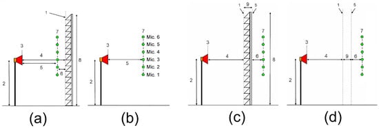 Quick System measurement configurations. (a) Sound Reflection Index measurement, barrier measurement; (b) free-field measurement for Sound Reflection Index; (c) Sound Insulation Index measurement, barrier measurement; (d) free-field measurement for Sound Insulation Index; 1: barrier reference surface; 2: height of sound source = 2 m; 3: sound source front surface; 4: distance between sound source and barrier reference surface = 1.5 m for RI measurement and = 1 m for SI measurement; 5: distance between sound source and microphone grid = 1.25 m; 6: microphone grid-reference surface distance = 0.25 m (on front side of barrier in case of RI measurement or on the read side of the barrier for SI measurement); 7: microphone grid; 8: barrier height; 9: barrier thickness.