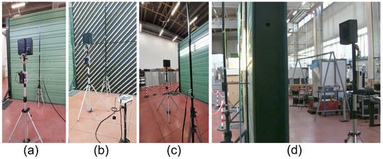 Laboratory repeatability measurements with Quick System. (a) Sound Reflection Index measurement on perforated metal barrier; (b) Sound Reflection Index measurement on the OSB3 non-flat barrier; (c) free-field measurement; (d) Sound Insulation Index measurement.