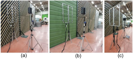 Laboratory repeatability measurements with Adrienne system. (a) Sound Reflection Index measurement on the OSB3 non-flat barrier; (b) Sound Reflection Index measurement on perforated metal barrier; (c) free-field measurement.